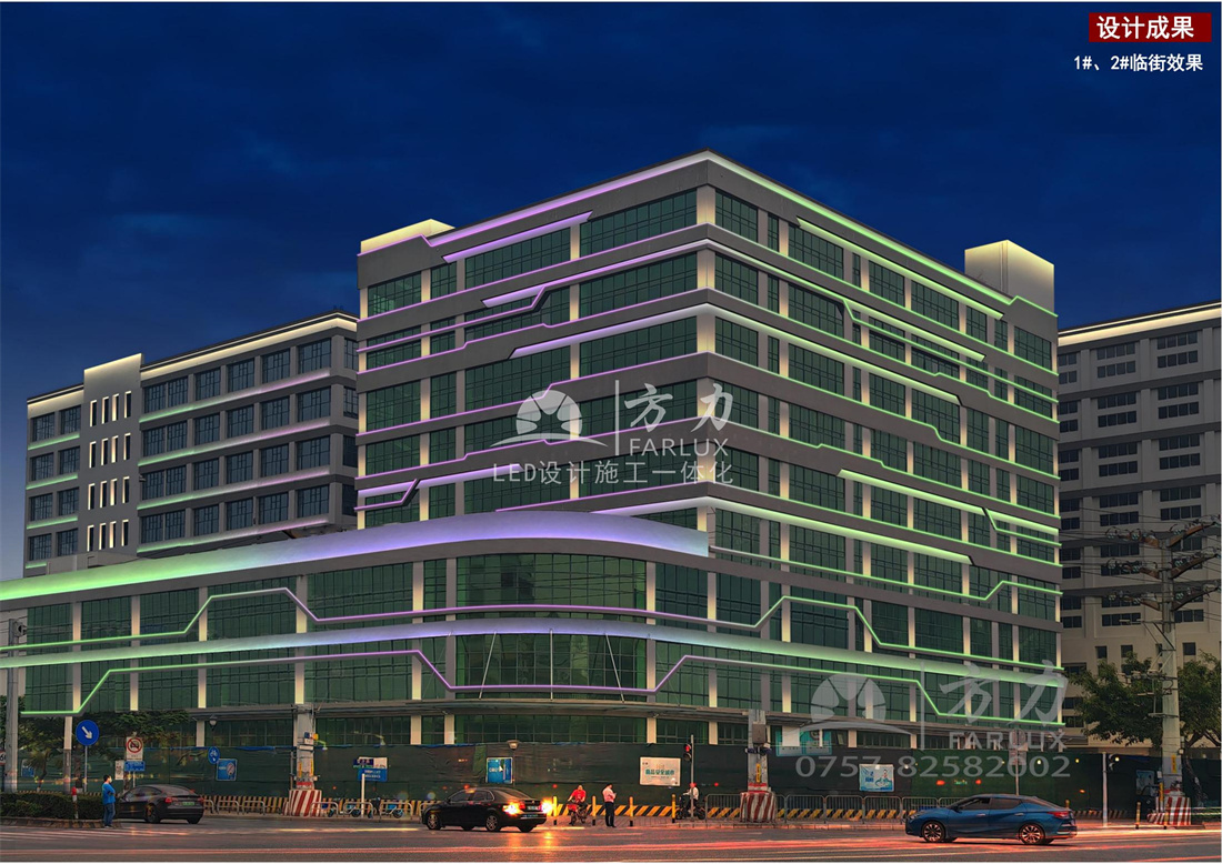 4栋厂房采用统一天际轮廓线的设计手法,通过洗墙灯将厂房屋顶一圈洗亮